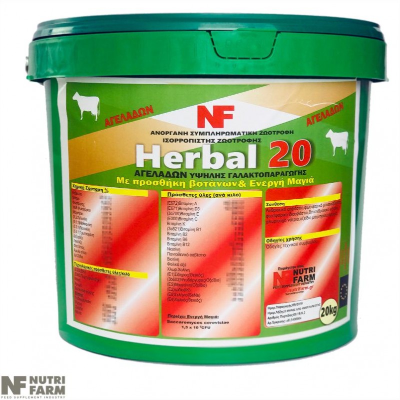 Adding daily to the feed of lactating cows the product Herbal 20 we cover their daily needs of inorganic nutrients and vitamins and achieve increased milk production.
