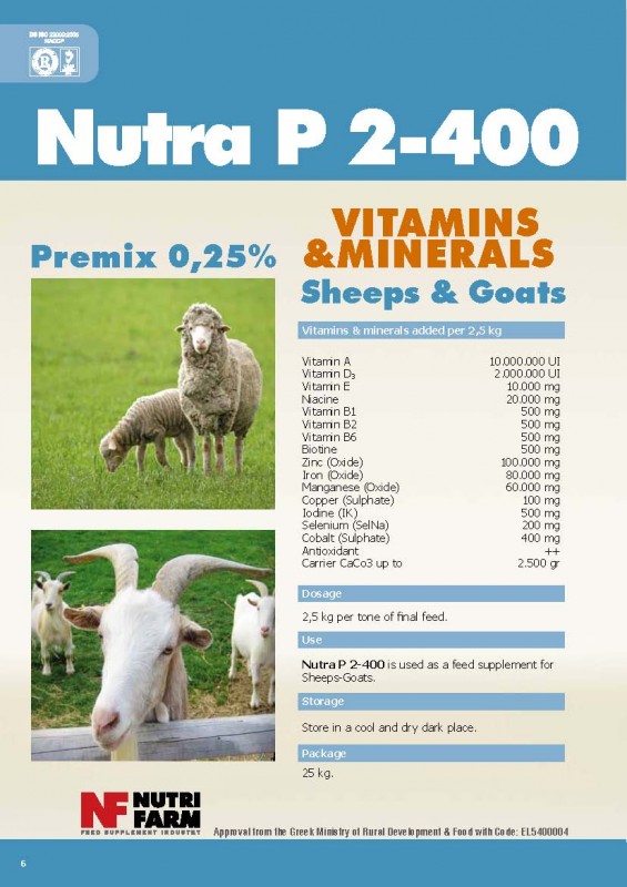 Nutra P 2-400 is a nutritional feed supplement rich in vitamins and minerals for sheeps and goats.Package