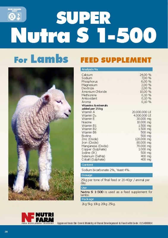 Nutra S 1-500 Super is a feed supplement used for lambs.