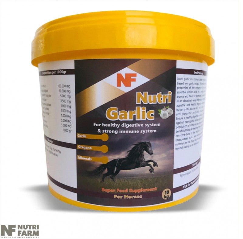 Nutri garlic is a concentrated nutritional supplement based on garlic extract. It combines the beneficial properties of theoregano -oil, trace minerals and essential amino acids in a product with a pleasant aroma and flavor. It promotes the health of the horse in an absolutely easy and natural way, ensuring good appetite and healthy digestion. Garlic and oregano have anti-bacterial, antiviral, anti-fungal, anti-parasitic and anti-inflammator y activity. Ensure a healthy digestive system by selectively acting against pathogenic microorganisms, by reducing the population of intestinal parasites, while protecting the beneficial flora.Αt the same time as the smell of sweat, can contribute to the reduction of disturbing insects (mosquitoes, ticks , and worms) especially during the summer period. It can also be applied as a patch in the wounds acting as an antiseptic.