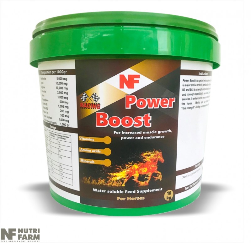 Power Boost is a special feed supplement that contains 6 major amino acids in combination with vitamins B1, B2 and B6. Its strength composition improves stamina and strength especially in race horses. Combined with exercise, it enhances the muscular development of the horse. Ideally you can provide horse with "the strength" during race preparation periods.Package