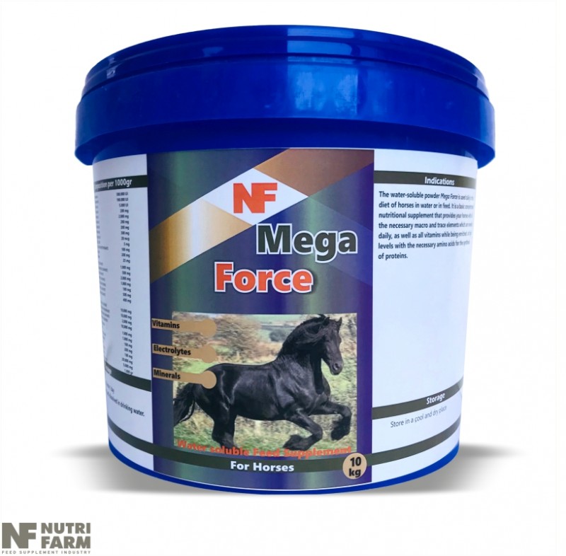 The water-soluble powder Mega Force is used daily in the diet of horses in water or in feed. It is a basic concentrated nutritional supplement that provides your horses with all the necessary macro and trace elements which are needed daily, as well as all vitamins while being enriched at high levels with the necessary amino acids for the synthesis of proteins.