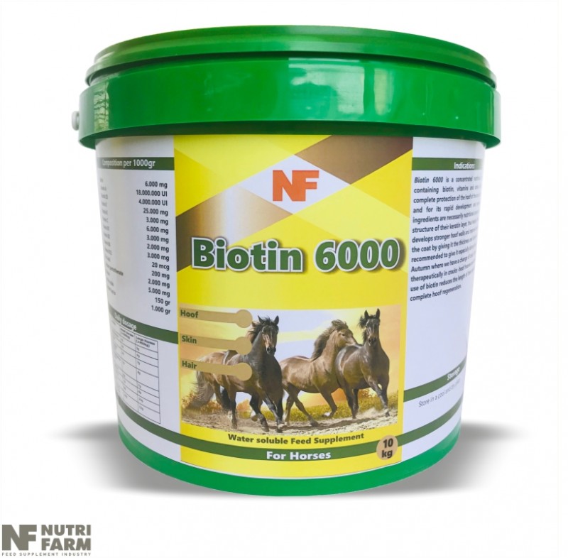 Biotin 6000 is a concentrated nutritional supplement containing biotin, vitamins and amino acids for the complete protection of the hoof of the skin and the hair and for its rapid development and regeneration. Its ingredients are necessarily nutritional components of the structure of their keratin layer, thus helping the horse develops stronger hoof walls and improve the quality of the coat by giving it the thickness and luster needed. It is recommended to give it especially during the Spring or Autumn where we have a change of coat. It also works therapeutically in cracks -hoof hooves and dermatoses. The use of biotin reduces the length of time required for complete hoof regeneration.