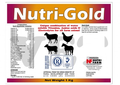 Nutri-Gold is a water soluble supplement rich in vitamins, amino acids and electrolytes that can be used in drinking water or in feed for all farm animals.