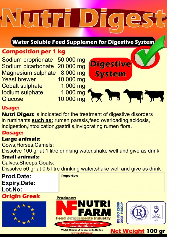 Nutri Digest is indicated for the treatment of digestive disorders in ruminants, such as: rumen paresis, feed overloading, acidosis, indigestion, intoxication ,gastritis and invigorating rumen flora.