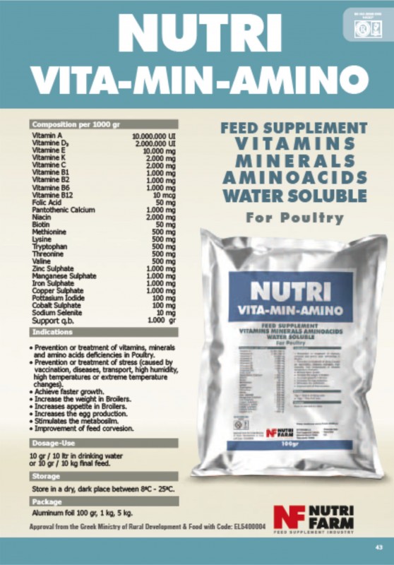 Nutri Vita-Min-Amino is a water soluble feed supplement with a strong combination of vitamins , minerals and amino acids for all animals. It also greatly helps for stress of animals caused by vaccinations, increase or decrease temperature, high humidity, with beneficial effects during the recovery after various diseases. Used preventive and aids in cases of vitamin deficiency, lack of micronutrients as an adjunct to metabolic diseases in combination with antibiotic therapy in cases of diarrhea helps prevent dehydration. Used as an additional during vaccination. Also using achieve weight gain, increase egg production, maintaining the proper health of the animals.Package