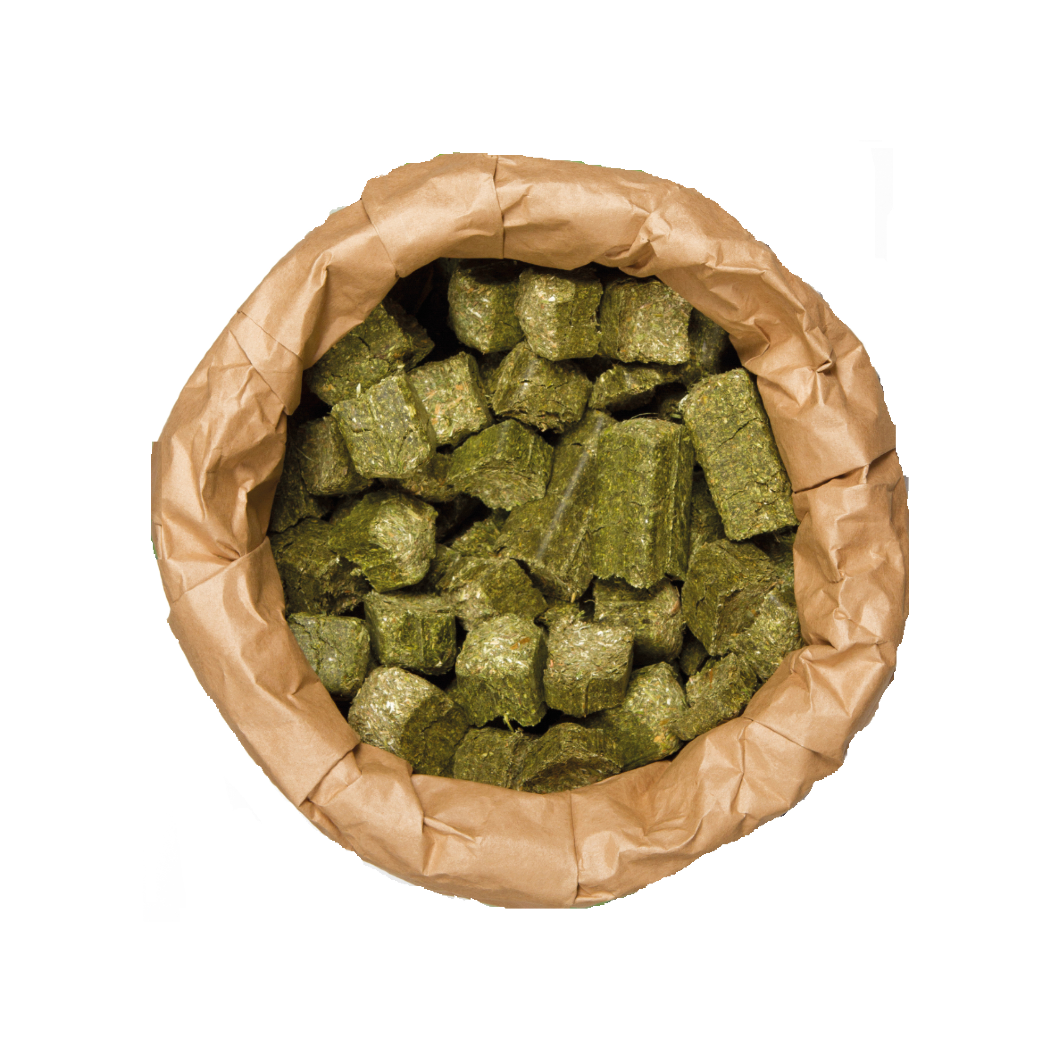 Pure alfalfa naturally grown on Italian fields, dehydrated, chopped and pressed into cubes through a mechanical process that involves no additives.