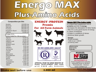 EnergoMAX Plus Amino Acids is a liquid feed supplement for all farm animals,rich in proteins and energy.