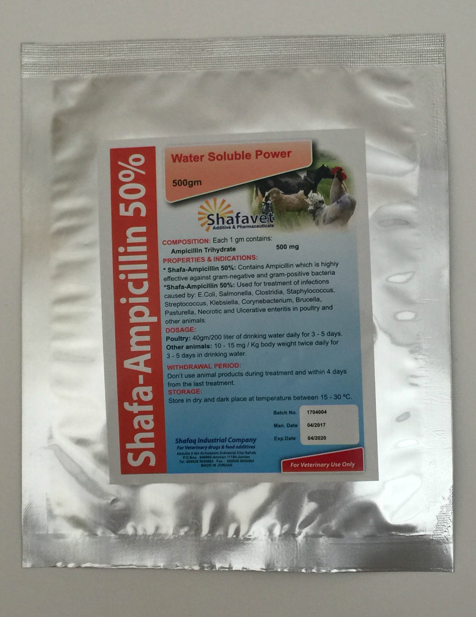 AMPICILLIN 50% used for treatment on infections caused by; E.coli,Clostridia, salmonella, staphylococcus, streptococcus,klebsiella,pasturella , Brucella, corynebacterium, Necrotic and ulcerative anteritis in poultry and other animlas.