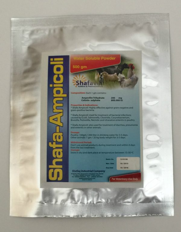Shafa-Ampicoli used for treatment of necrotic and ulcerative enteritis, bacterial infections caused by E.coli, salmonella,Clostridia, corynebacterium, Brucella and pasturella that affect poultry.
