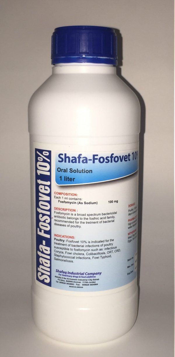 SHAFA – FOSFOVET 10% Fosfomycin is a broad spectrum bactericidal antibiotic belongs to the fosfnic acid family , recommended for the treatment of bacterial diseases of poultry.