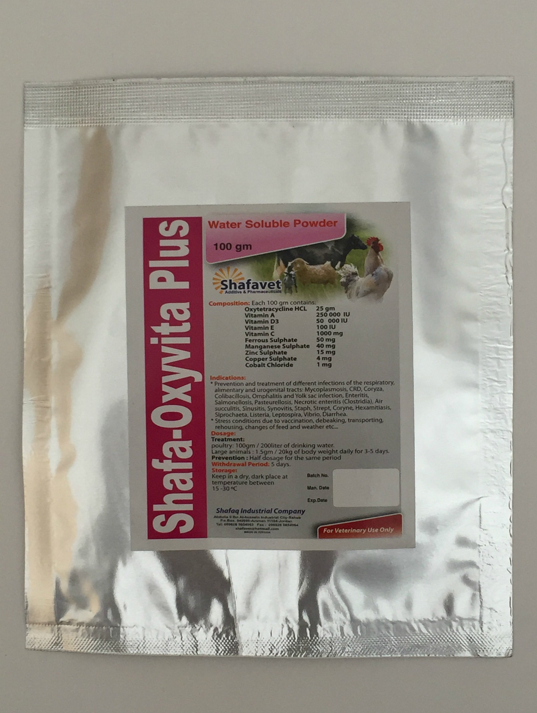 SHAFA – OXYVITA PLUS prevention and treatment of different infections of the respiratory , alimentary and urogenital tracts: Mycoplasmosis , CRD , Coryza , Colibacillosis , Omphalitis and Yolk sac infection , Enteritis Salmonellosis , Pasteurellosis , Necrotic enteritis (Clostridia) , Air succulitis,Sinusitis , Synovitis , staph , Strept , Coryne , Hexamitiasis , Siprochaeta , Listeria , Leptospira , Vibrio , Diarrhea.