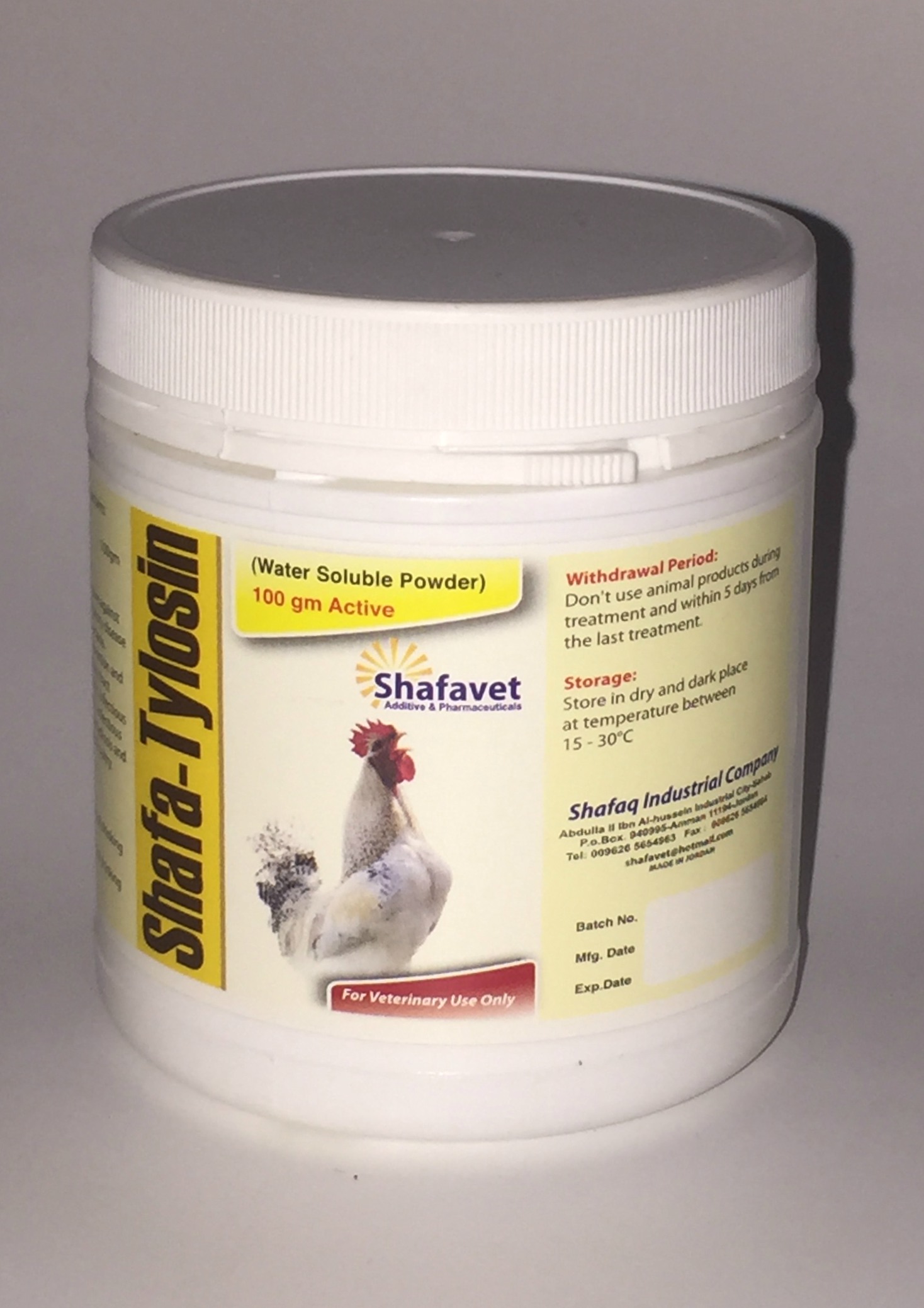 SHAFA – TYLOSIN used for prevention and treatment of many respiratory tract diseases such as; Air sacculitis , Infectious synovitis , Infectious sinusitis , Infectious coryza , Spirochaetosis , Chlamydiosis and stress conditions that effect Poultry.