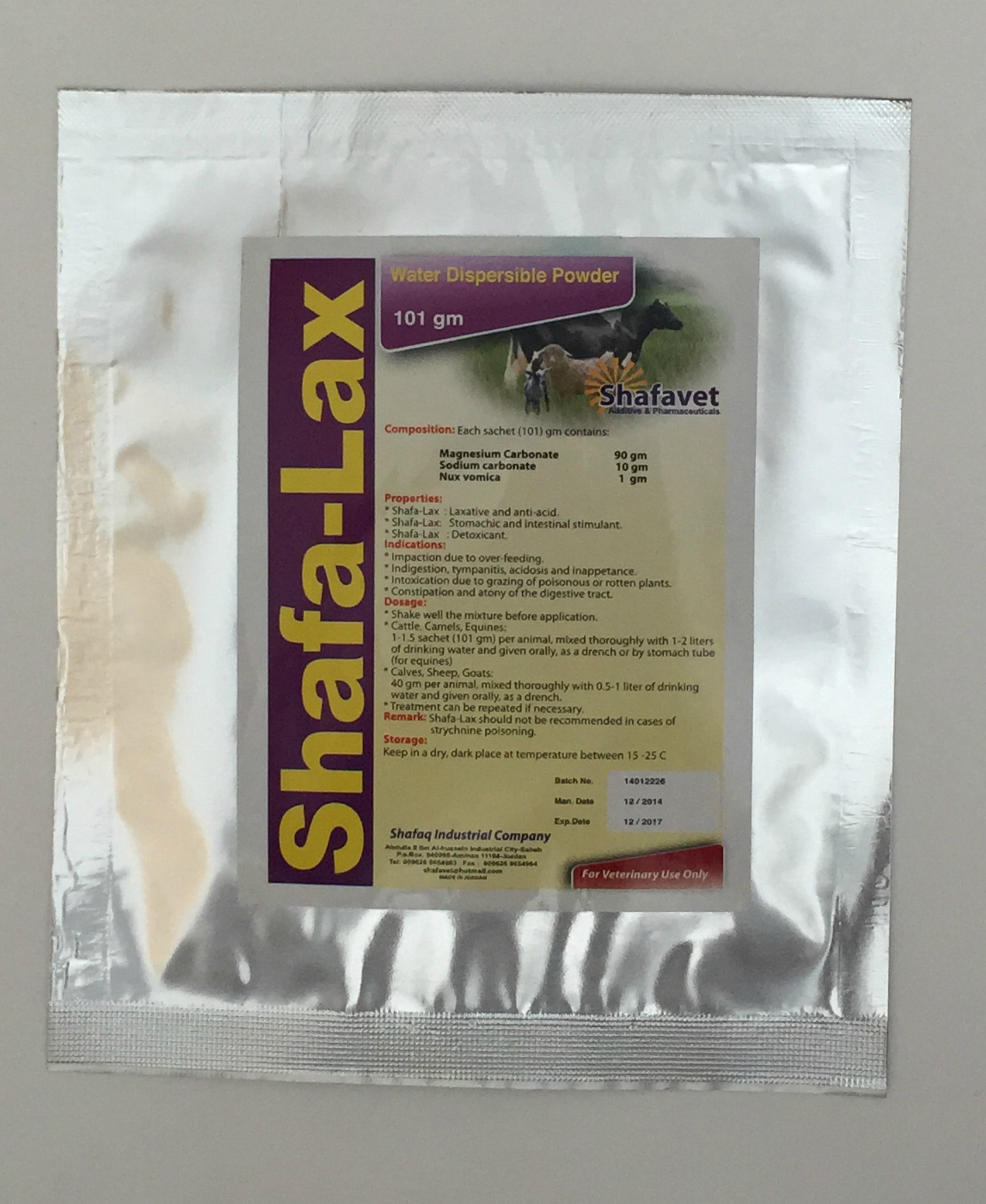 Cattle , Camels , Equines: (1-1.5) sachet (101 gm) per animal , mixed thoroughly with 1-2 liters of drinking water and given orally , as a drench or by stomach tube (for equines)